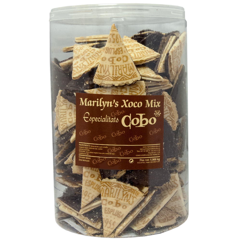 Pot cilíndric amb Marilyn’s  banyats fins la meitat amb xocolata negra del 60% de cacau.