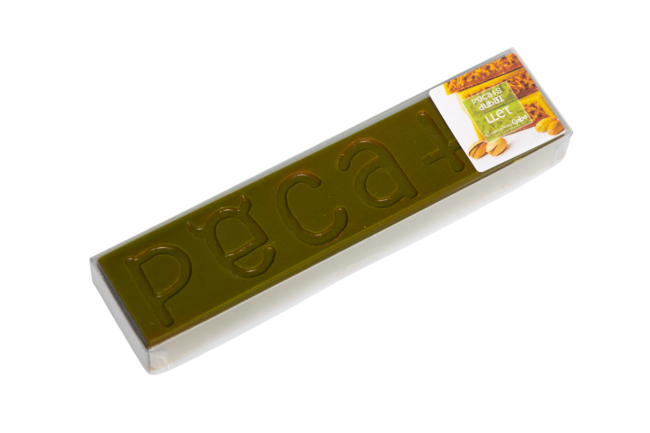 Els pecats DUBAI, són rajoles gruixudes de xocolata de màxima qualitat farcides de farcit Dubai, utilitzant pistatxo, fils de “kadayif” i xocolata amb llet.